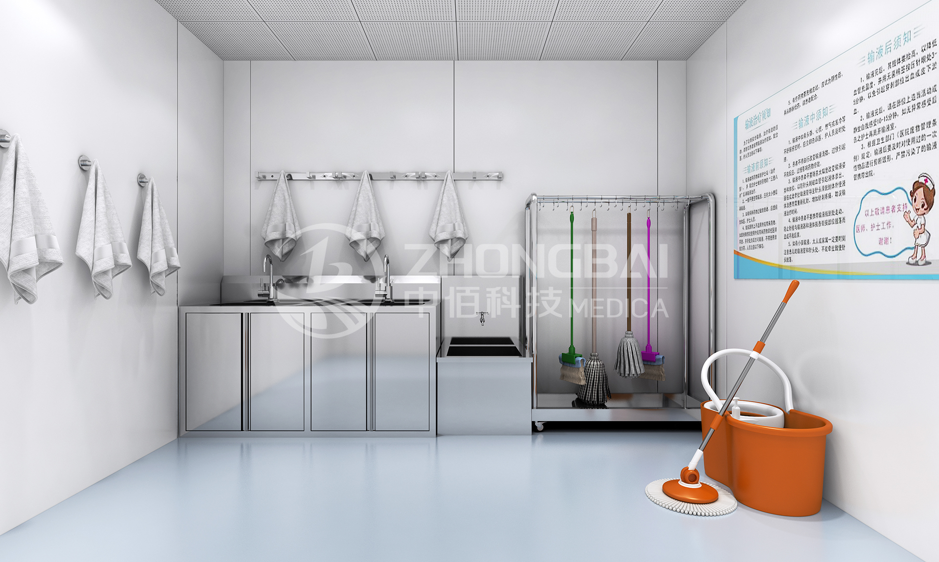 處置室一般在治療室近處,主要為醫護人員實施皮膚準備及清潔灌腸等操作,臨時存放治療產生的醫療廢物及需要浸泡消費的醫療物品的專用工作室。